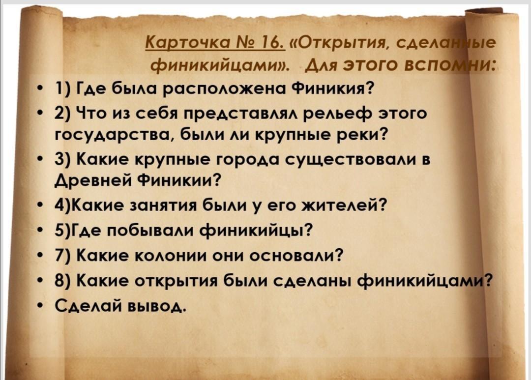 5) Финикийцы огибали Африку, выходя из Красного моря, снова возвращаясь в Египет через Средиземное море. Финикийцы побывали и у берегов далекой Индии. За один раз они привезли оттуда более тонны золота,
