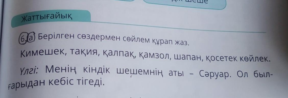 Жаттығайық 60) Берілген сөздермен сөйлем құрап жаз. Кимешек, тақия, қалпақ, қамзол, шапан, қосетек көйлек. Үлгі: Менің кіндік шешемнің аты – Сәруар. Ол был- ғарыдан кебіс тігеді. Кеп нүктенің орнына тиісті қосымшаны жаз. пж срочно дам 5 ⭐ и ❤️❤️ лайкну если правильно сделаете задание. пж срочно срочно срочно пж