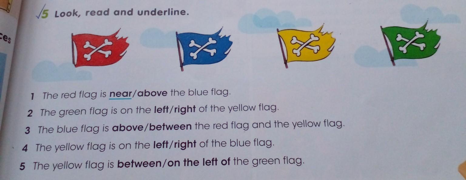 Look, read and underline. 1 The red flag is near/above the blue flag. 2 The green flag is on the left/right of the yellow flag, 3 The blue flag is above/between the red flag and the yellow flag. 4. The yellow flag is on the left/right of the blue flag. 5 The yellow flag is between/on the left of the green flag.