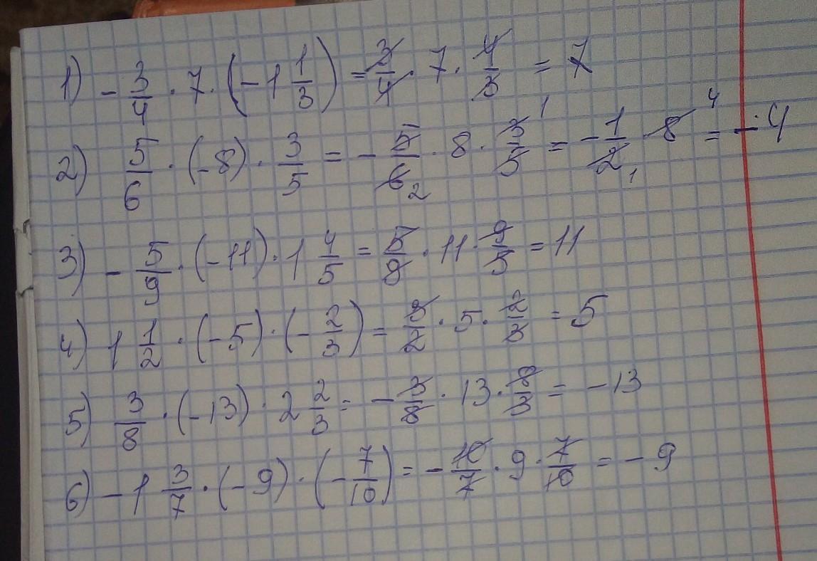 №499. 1)-3/4×7×(-1. 1/3); 2)5/6×(-8)×3/5; 3)-5/9×(-11)×1`4/5; 4)1. 1/2×(-5)×(-2/3); 5)3/8×(-13)×2. 2/3; 6)-1. 3/7×(-9)×(-7/10);
