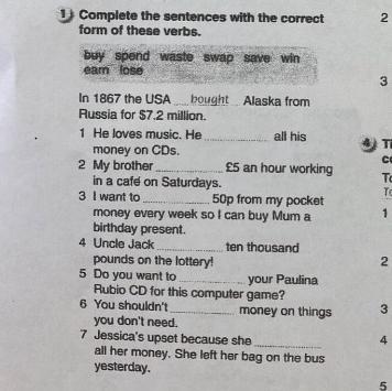 1)spends 2)earns 3)save 4)wins 5)swap 6)waste 7)lose