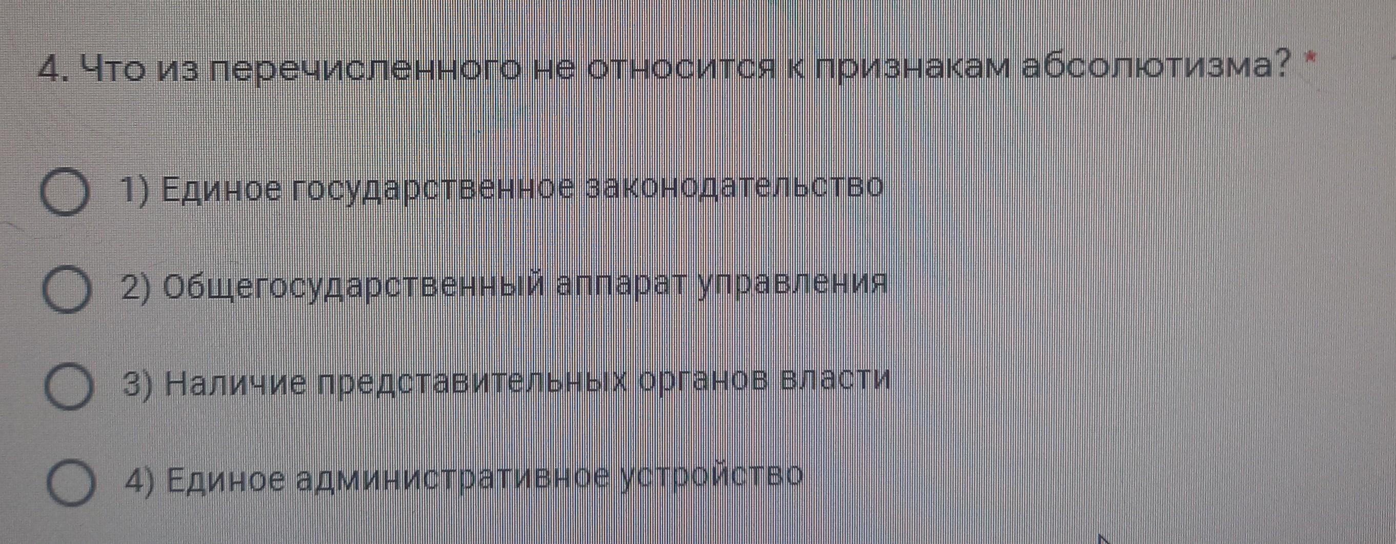 4. Что из перечисленного не относится к признакам абсолютизма? (1) Единое государственное законодательство 2) общегосударственный аппарат управления 3) Наличие представительных органов власти 4) Единое административное устройство