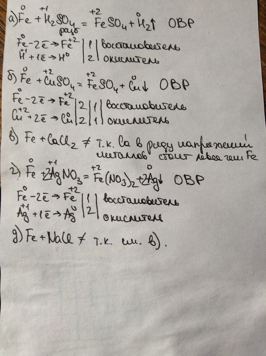 Железные гвоздики поместили в пробирки с растворами а)h2so4, б)cuso4, в)cacl2, г)agNo3 д)Nacl В каких пробирках произойдут химические реакции? Опишите явление в каждой из пробирок.Напишите уравнение этой реакции и составьте электронный баланс.