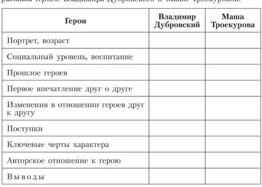 Мария Троекурова - дочь богатого человека. Несмотря на то, что отец не славится наличием прекрасного образования и манер, девушка получила хорошее воспитание. У неё были учителя, гувернантки. Героиня сама проявляла интерес к книгам. Её социальный статус находится в отличном положении. Это нельзя сказать про Дубровского, который на данный момент является скрытым разбойником. Но он очень талантлив, трудолюбив. Если бы не смерть отца, юноша смог бы закончить обучение и стать хорошим военным офицером.