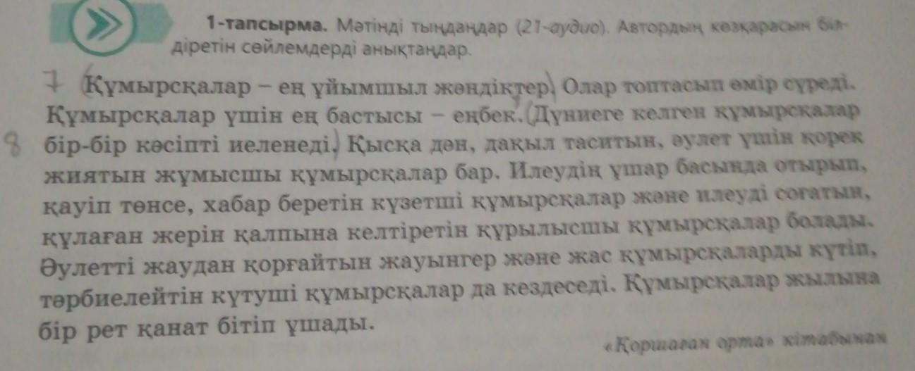 2-тапсырма. Сұрақтарға жауап беріңдер 1. Құмырсқалар қандай жәндіктер? 2. Құмырсқалардың ұйымшылдығы неден көрінеді? 3. Құмырсқалардың татулығы адамдарға үлгі бола ма? 4. Олар ынтымақтасып еңбек еткенде қандай жұмыстар атқарады?