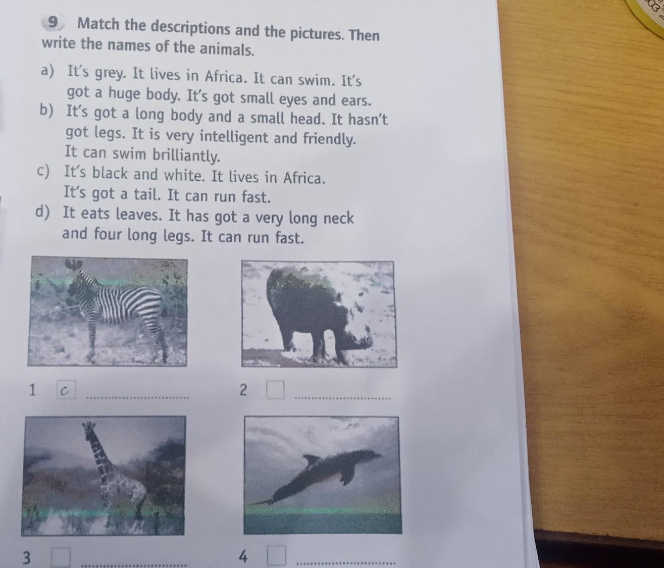 B - 4. Dolphin. It's got a long body and small head. It hasn't got legs. It is very intelligent and friendly. It can swim brilliantly.