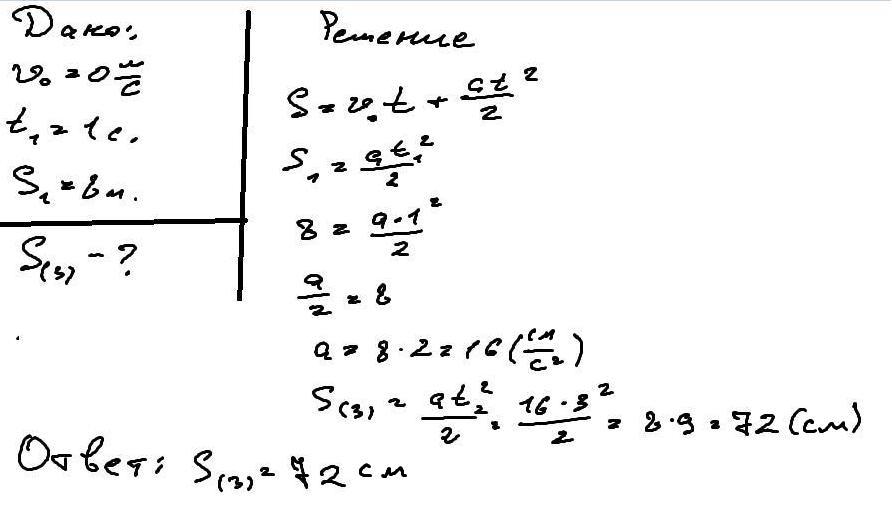 Шарик скатывающийся из состояния покоя по наклонному желобу, в первую секунду прошёл 8 см. Какой путь пройдёт шарик за 3с