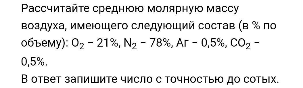 Мср (возд) = (0,21·32 + 0,78 ·28 + 0,005 ·40 + 0,005 ·44)/(0,21 + 0,78 + 0,005 + 0,005) = 29 г/моль.