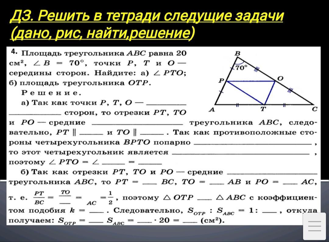 вторая задача под б) решается гораздо проще.... средние линии треугольника, проведенные к его сторонам, делят его на 4 равных треугольника. Следовательно площадь искомого треугольника равны площади данного деленная на 4....
