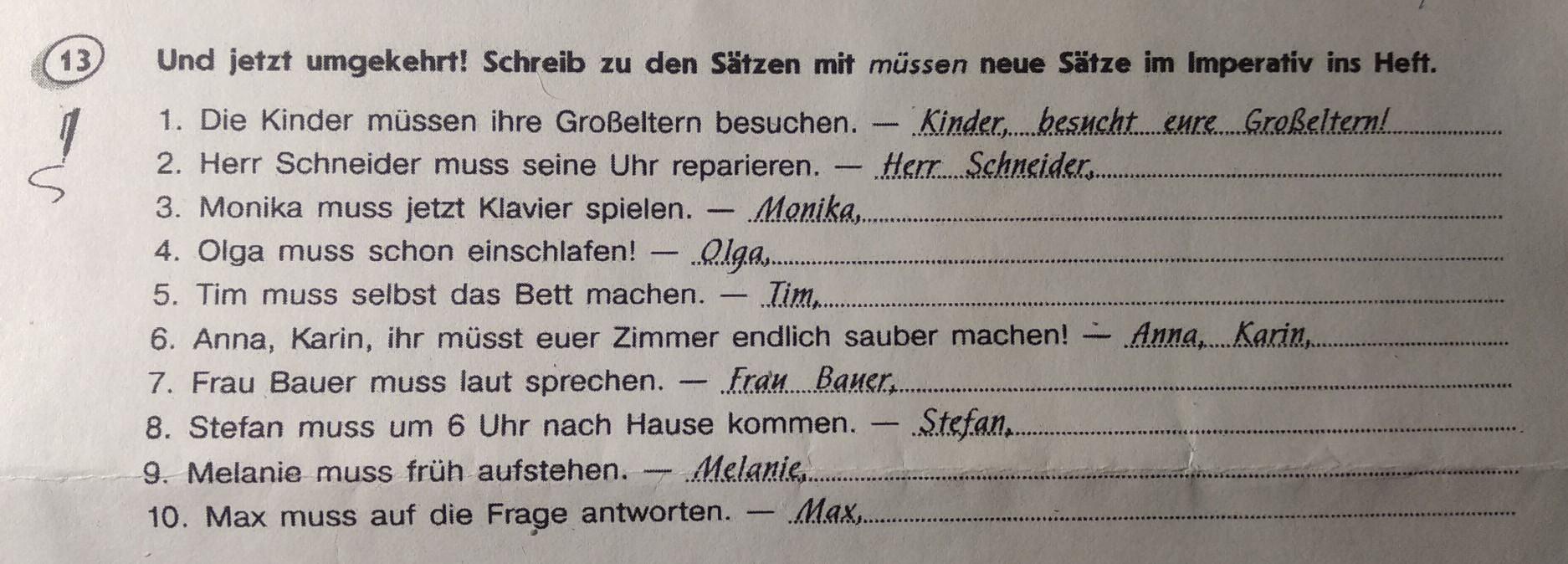 - - - Und jetzt umgekehrt! Schreib zu den Sätzen mit müssen neue Sätze im Imperativ ins Heft. 1. Die Kinder müssen ihre Großeltern besuchen. Kinder....besucht.euce...Greßeltern! 2. Herr Schneider muss seine Uhr reparieren. Herr Schneider, 3. Monika muss jetzt Klavier spielen. Monika.......... 4. Olga muss schon einschlafen! - Olga........... 5. Tim muss selbst das Bett machen. - Tim........ 6. Anna, Karin, ihr müsst euer Zimmer endlich sauber machen! - Anna, Karin 7. Frau Bauer muss laut sprechen. - Frau Bauer...... 8. Stefan muss um 6 Uhr nach Hause kommen. Stefan 9. Melanie muss früh aufstehen. Melanie... 10. Max muss auf die Frage antworten. - Max.............. -