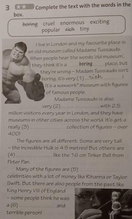 I live in London and my favourite place is an oid museum called Madame Tussauds. When people hear the words old museum', they think it's a boring place, but They're wrong - Madam Tussauds isn't boring, it's very (1) Its a waxwork museum with figures of famous people. Madame Tussauds is also Very (2) with 2.5 million visitors every year in London, and they have museums in other cities across the world. It's got a realy 3 collection of figures - over