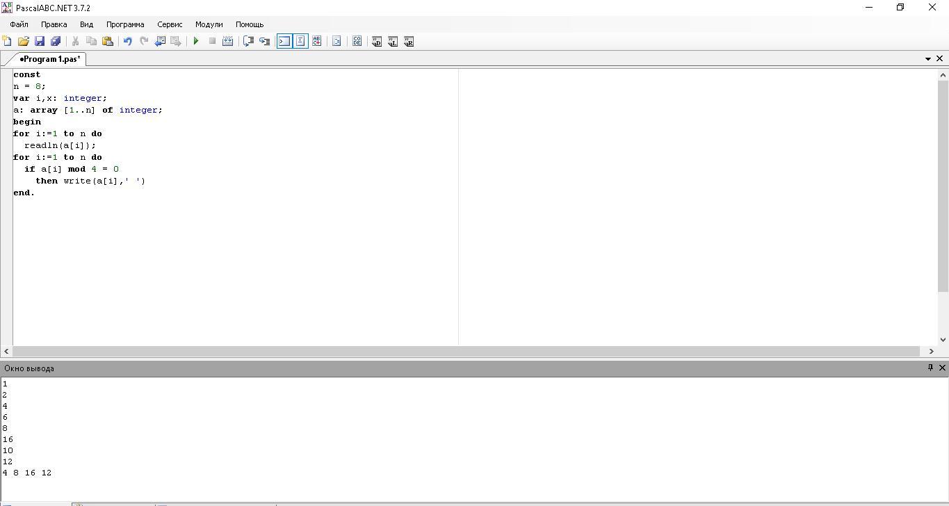 Помогите пожалуйста с информатикой. Среди 8 чисел, введенных с клавиатуры, вывести кратные 4.