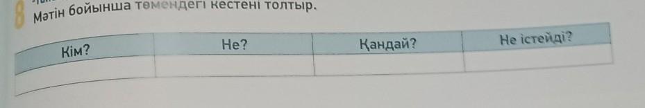 8 -тапсырма. Мәтін бойынша төмендегі кестені толтыр. Кім? Не істейді? Қадай He?