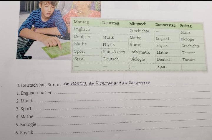 1.am Montag and am Donnerstag.2.am Dienstag and am Freitag.3.am Montag and am Donnerstag.4.am Montag,am Mittwoch and am Freitag.5.am Mittwoch and am Freitag.6.am Dienstag and am Donnerstag.(5 лет изучения немецкого языка ,всё правильно)