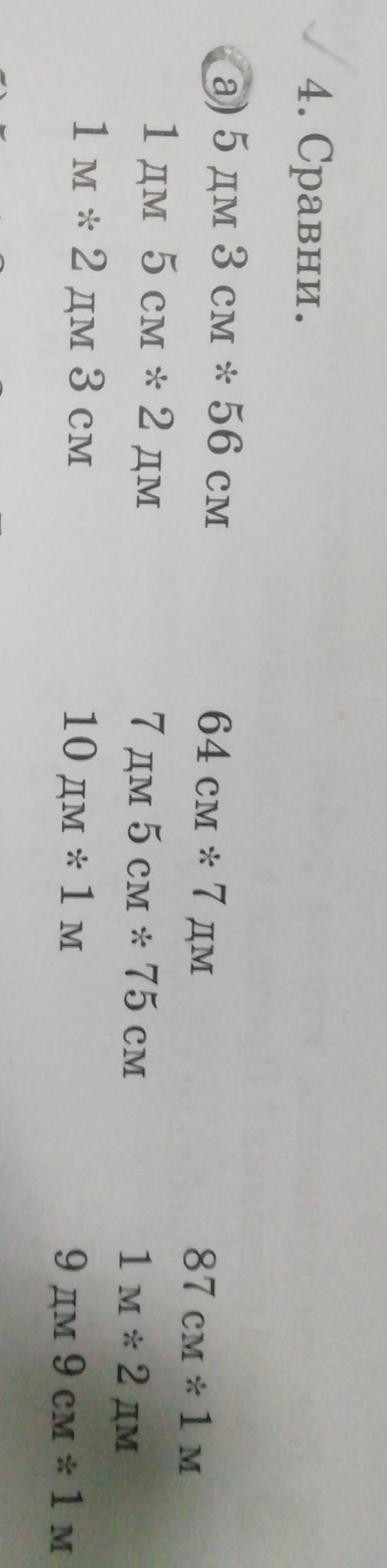 4. Сравни. ) а) 5 дм 3 см * 56 см 1 дм 5 см * 2 дм 2 1 м * 2 дм 3 см м2 64 см +7 дм 7 ДМ 5 см + 75 см 10 дм * 1 м 87 см * 1 м 1 м * 2 дм 9 дм 9 см * 1 м срочно помогите