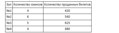 В четырех залах кинотеатра показывают новые фильмы. В разных залах разное количество мест и разное количество сеансов в день, но все билеты распроданы. В таблице показаны количество сеансов и количество проданных билетов. Сколько мест в самом вместительном зале?