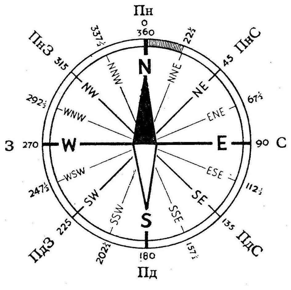 Північ — 0°;