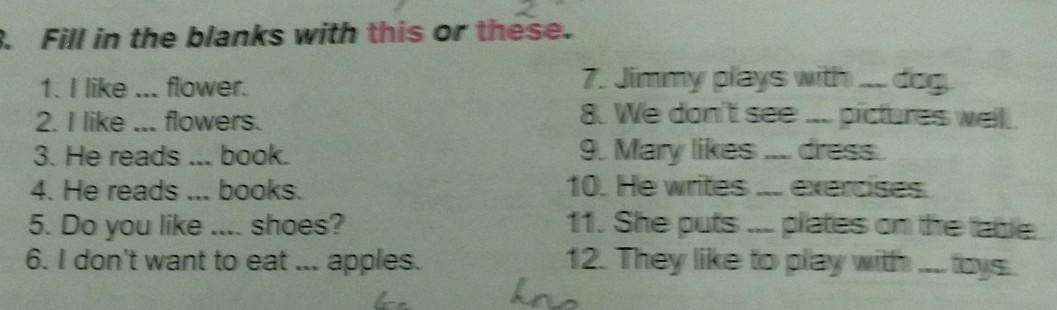 3. Fill in the blanks with this or these. 1. I like ... flower. 7. Jimmy plays with ... dog. 2. I like ... flowers. 8. We don't see ... pictures well. 3. He reads ... book. 9. Mary likes ... dress. 4. He reads ... books. 10. He writes ... exercises. 5. Do you like .... shoes? 11. She puts plates on the table. 6. I don't want to eat ... apples. 12. They like to play with ... toys