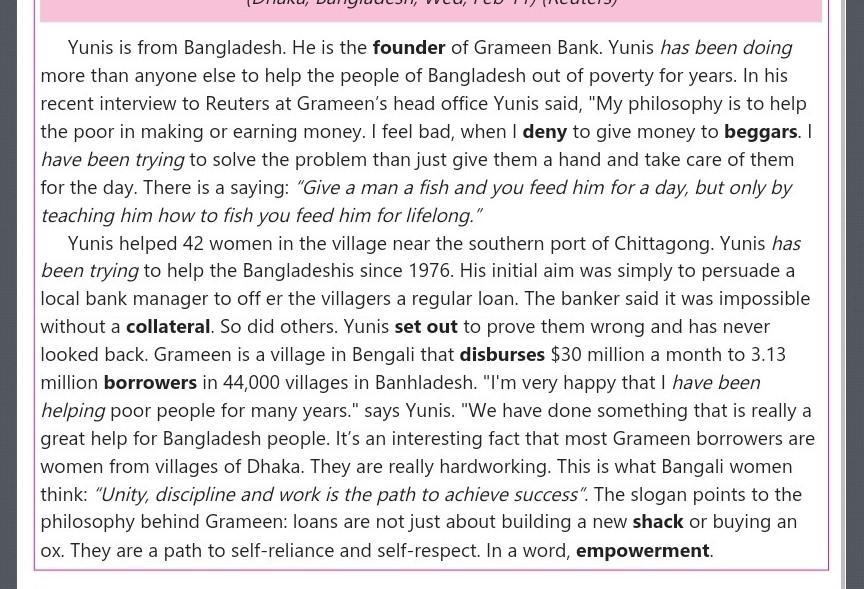Юнис из Бангладеш. Он является основателем Grameen Bank. Юнис делает больше, чем кто-либо другой, чтобы помочь народу Бангладеш выбраться из бедности на протяжении многих лет. В своем недавнем интервью агентству Reuters в головном офисе Grameen Юнис сказал: «Моя философия - помогать бедным в зарабатывании денег или зарабатывании денег. Мне плохо, когда я отказываюсь давать деньги нищим. Я пытался решить проблему, а не просто протянуть им руку и позаботься о них в течение дня. Есть поговорка: «Дай человеку рыбу, и ты накормишь его в течение дня, но только научив его ловить рыбу, ты будешь кормить его на всю жизнь». Юнис помог 42 женщин в деревне недалеко от южного порта Читтагонга. Юнис пытается помочь бангладешцам с 1976 года. Его первоначальная цель заключалась в том, чтобы просто убедить местного менеджера банка предложить сельским жителям регулярный кредит. Банкир сказал, что это невозможно без Обеспечения. То же самое сделали и другие. Юнис намеревался доказать, что они неправы, и никогда не оглядывался назад. Грамин - это деревня в Бенгалии, которая выплачивает 30 миллионов долларов в месяц 3,13 миллионам заемщиков в 44 000 деревень в Бангладеш. «Я очень рад, что у меня есть много лет помогать бедным, - говорит Юнис. Мы сделали то, что действительно очень помогло бангладешцам. Интересный факт, что большинство заемщиков Grameen - женщины из деревень Дакки. Они действительно трудолюбивы. Женщины Бангали думают так: «Единство, дисциплина и труд - путь к успеху». Слоган указывает на философию Grameen: ссуды - это не только строительство новой хижины или покупка быка. Это путь к уверенности в себе и самоуважению. Одним словом, расширение прав и возможностей.