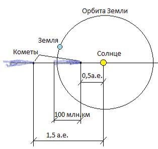 Ответ: Смотрите рисунок. Земля может пройти через хвост только одной кометы, той, которая подходит ближе к Солнцу. Конец хвоста этой кометы будет располагаться на расстоянии более 0,5 а.е. + 100 млн.км = 150 млн. км/2 +100 млн.км = 175 млн.км. А Земля удалена от Солнца на расстояние 150 млн.км.