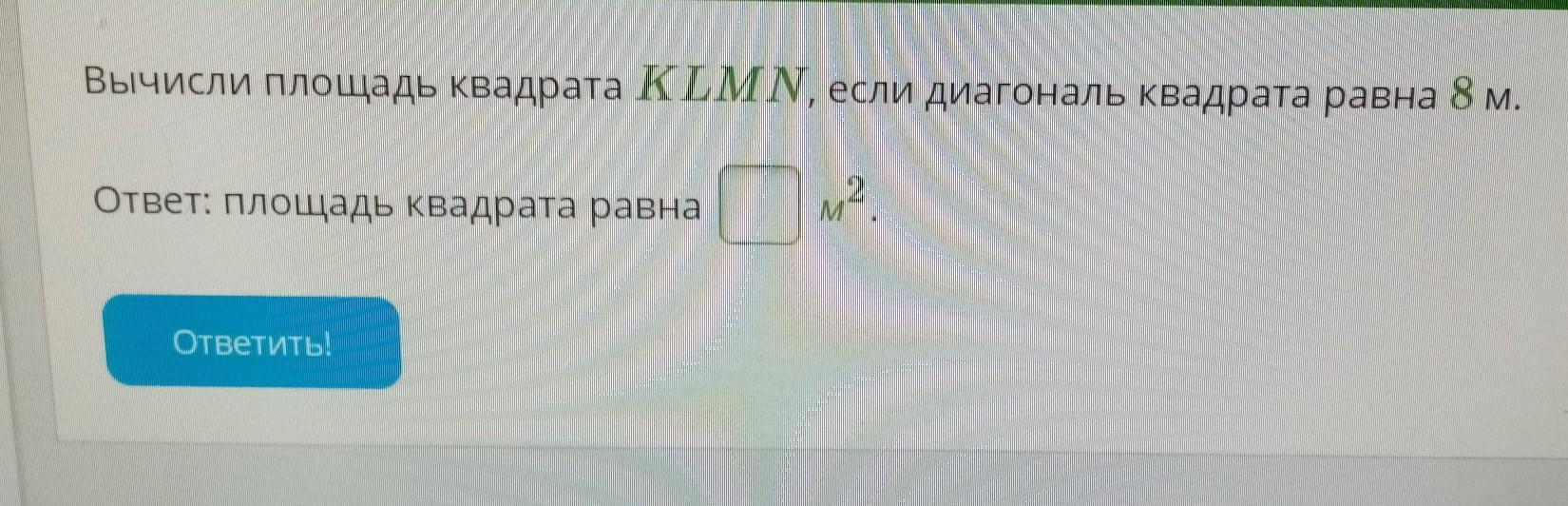 Вычисли площадь квадрата KLMN, если диагональ квадрата равна 8 м.