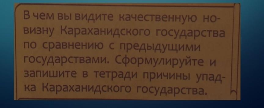 4. Присоединение Мавераннахра (территории современного Узбекистана, южных областей Казахстана и севера Таджикистана). Поглощение Мавераннахра в Х в. правителями Караханидского государства и уничтожение ими Саманидского эмирата увеличило территорию государства Караханидов, что в совокупности с вышеизложенными причинами ослабляло единство государства и облегчало его распад на две части.
