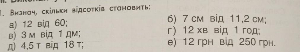 1. Визнач, скільки відсотків становить: а) 12 від 60; в) 3м від 1 дм; д) 4,5 т від 18 т; б) 7 см від 11,2 см ) 12 хв від 1 год, е) 12 грн від 250 грн.