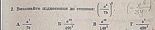 (-\frac{a^5}{7b})^2=(\frac{a^5}{7b})^2=\frac{(a^5)^2}{(7b)^2}=\frac{a^1^0}{49b^2}