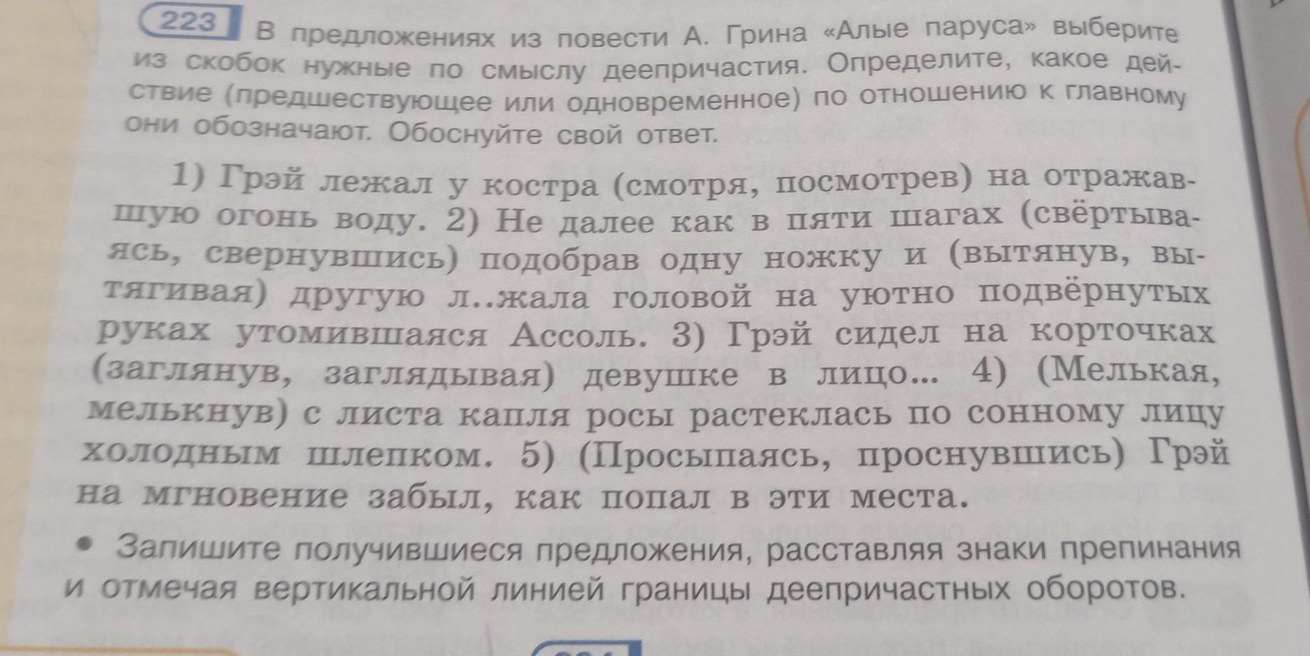 1) Грэй лежал у костра, смотря на отражавшую огонь воду. 2) Не далее, как в пяти шагах, свернувшись, подобрав одну ножку и вытянув другую, лежала головой на уютно подвёрнутых руках утомившаяся Acсоль. 3) Грэй сидел на корточках, заглядывая девушке в лицо... 4) Мелькнув с листа, капля росы растеклась по сонному лицу холодным шлепком. 5) Проснувшись, Грэй на мгновение забыл, как попал в эти места.