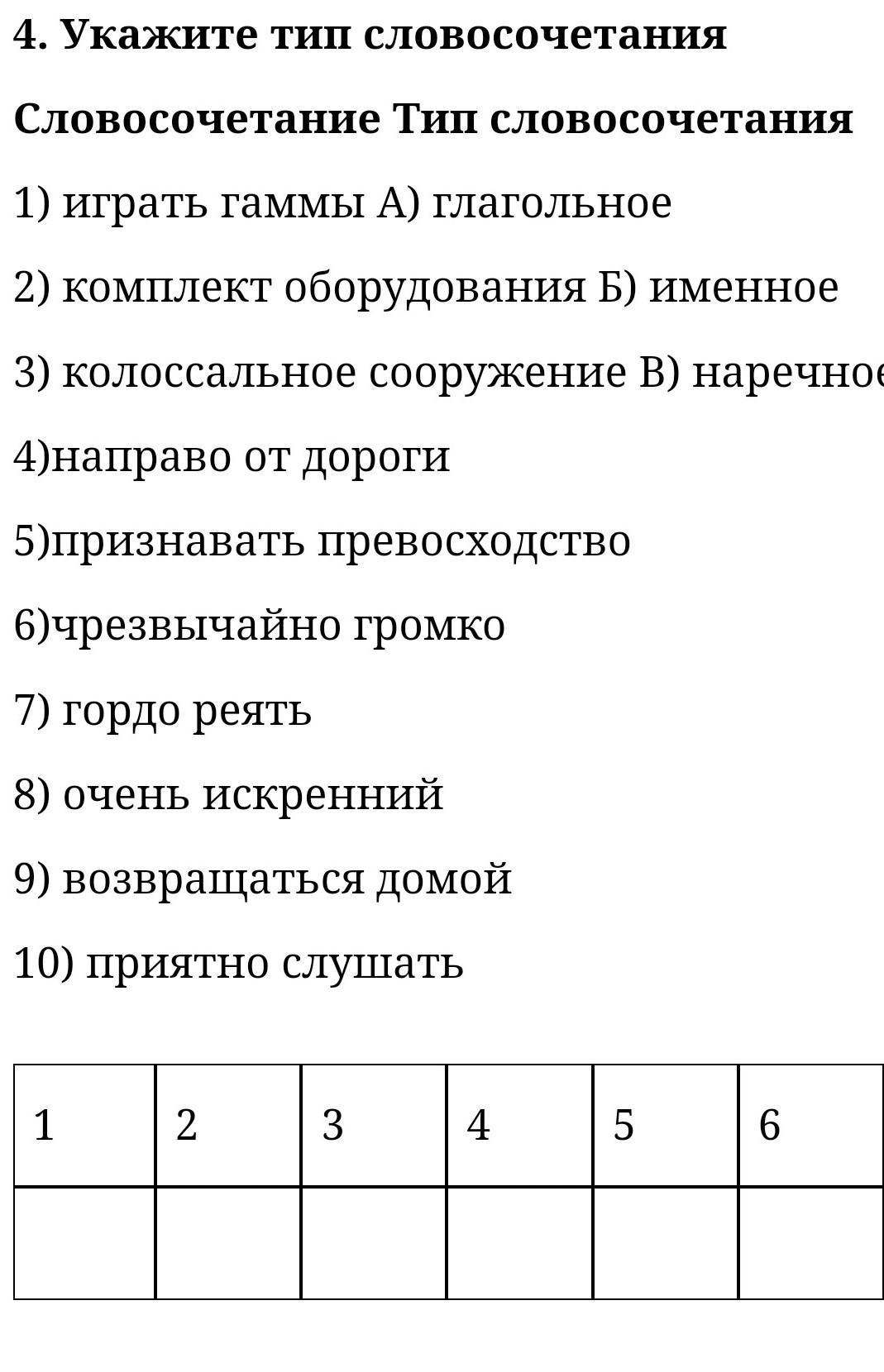 Укажите тип словосочетания Словосочетание Тип словосочетания 1) играть гаммы