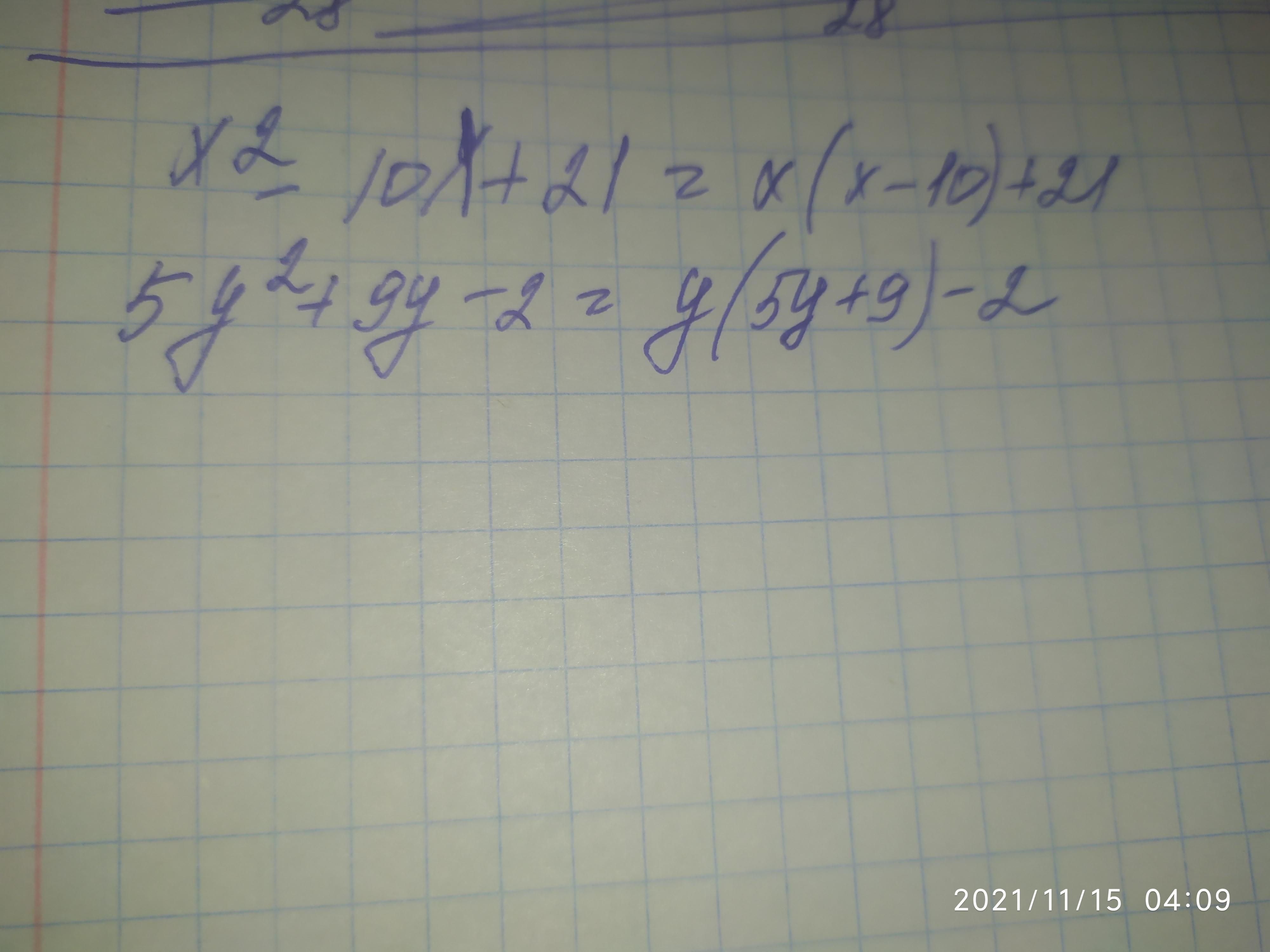Разложите на множители квадратный трехчлен: а) х2-10х+21; б) 5у2+9у-2.