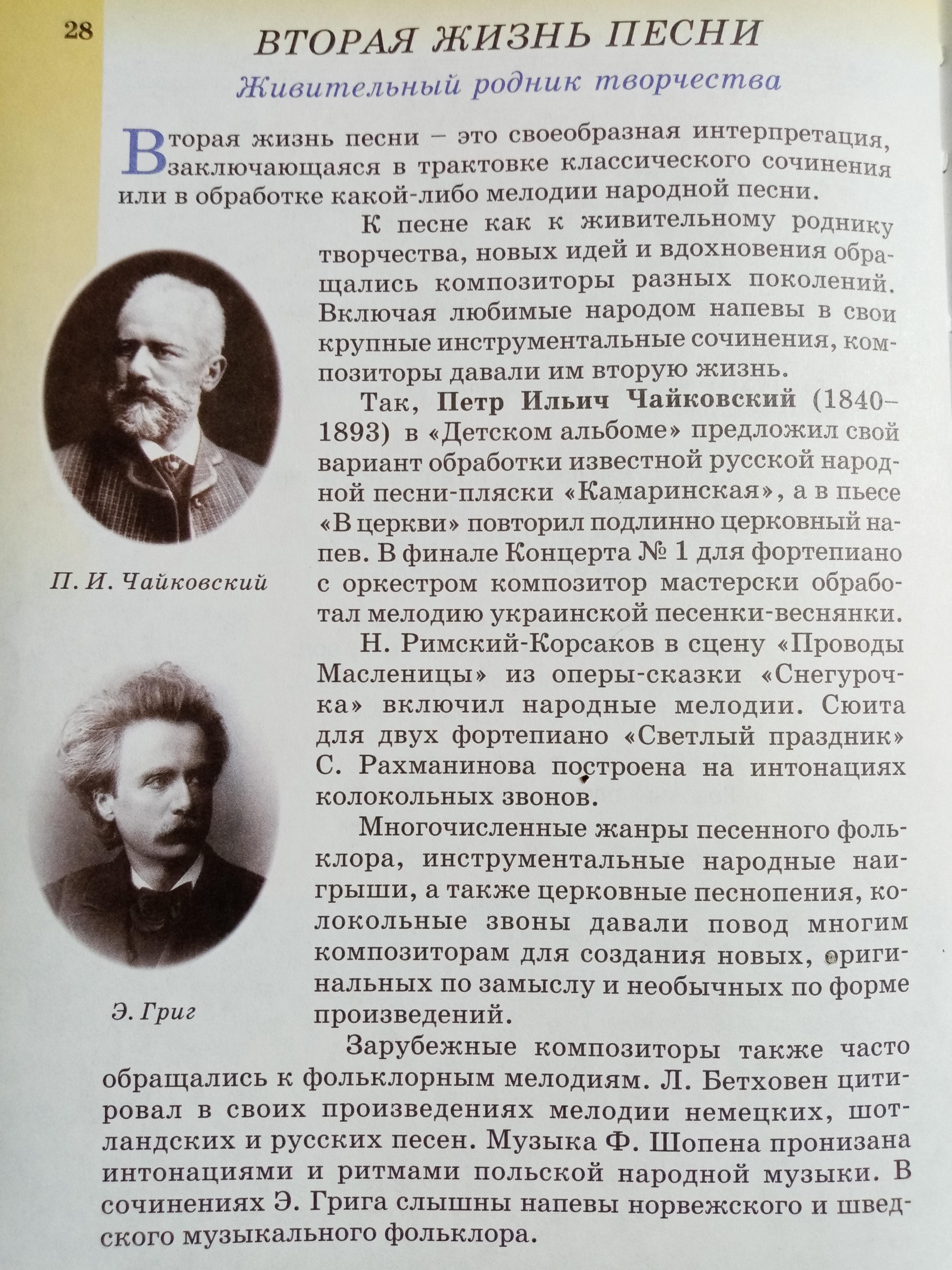 Уч. Стр. 28 Прочитать. Послушать укр. народну песню - веснянку "Выйди, выйди Иваньку " и рус. народную песню "Во поле берёза стояла" . Затем послушать 3 часть концерта №1 П.И. Чайковского и 4 часть Симфонии № 4. Письменно ответить на вопросы: 1.Какие 2 народные песни использует Чайковский в 3 части концерта и 4 части симфонии? 2. Что нарисовал муз. красками композитор в 3 части 1 концерта?