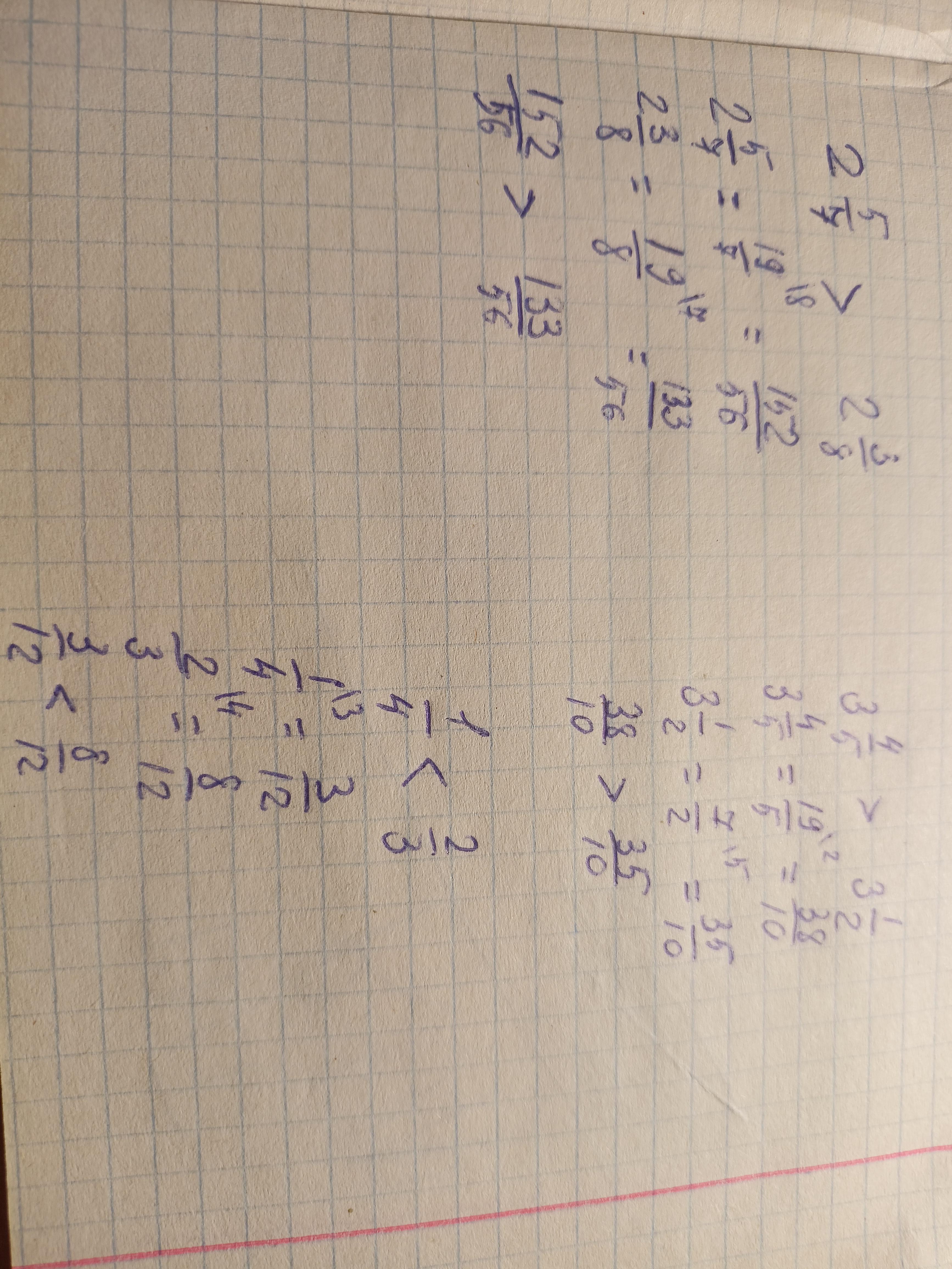 Сравните смешанные числа и запишите результат с помощью знаков больше или меньше пожалуйста срочно даю 10-15 баллов 2 5/7 и 2 3/8 3 4/5 и 3 1/2 и 1/4 и 2/3 пожалуйста срочно только полный ответ как решать ответ мне не нужны как решать мне надо срочно Ладно даю 50 балловпожалуйста Я на уроке сижу 100 баллов даю