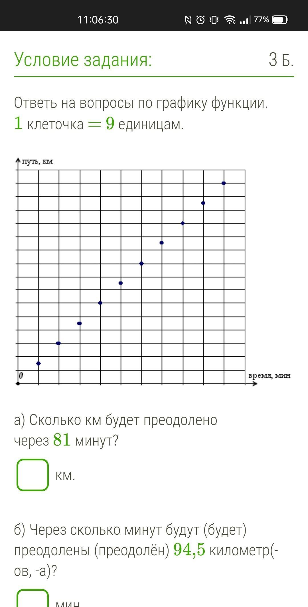 Ответь на вопросы по графику функции. 1 клеточка = 9 единицам. bildiite.PNG a) Сколько км будет преодолено через 81 минут? км. б) Через сколько минут будут (будет) преодолены (преодолён) 94,5 километр(-ов, -а)? мин.