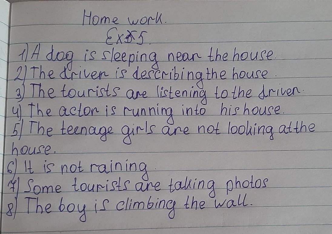 5 Complete the sentences using the present continuous form of the verbs in the box. climb describe listen took not look not rain run sleep take Two teenage girls are looking in a mirror. 1 A dog — near the house. 2 The driver the house. 3 The tourists to the driver 4 The actor_into his house. 5 The teenage girls at the house. 6 It - 7 Some tourists - photos. 8 The boy - the wall.д