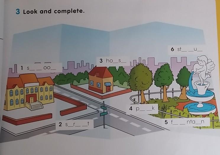1 school 2 street 3 house 4 park 5 fountain 6 statue