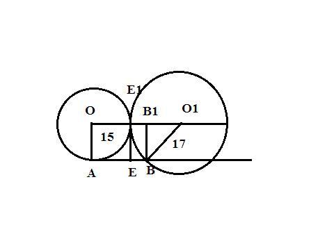 о и круг D. Две окружности с радиусами 15 и 17 касаются Внешним образом. Через точку А меньшей окружности параллельно отрезку, соединяющему центры окружностей, проведена касательная, пересекающая большую окружность в точках В и С (точка В лежит между A и C). Найдите AB.