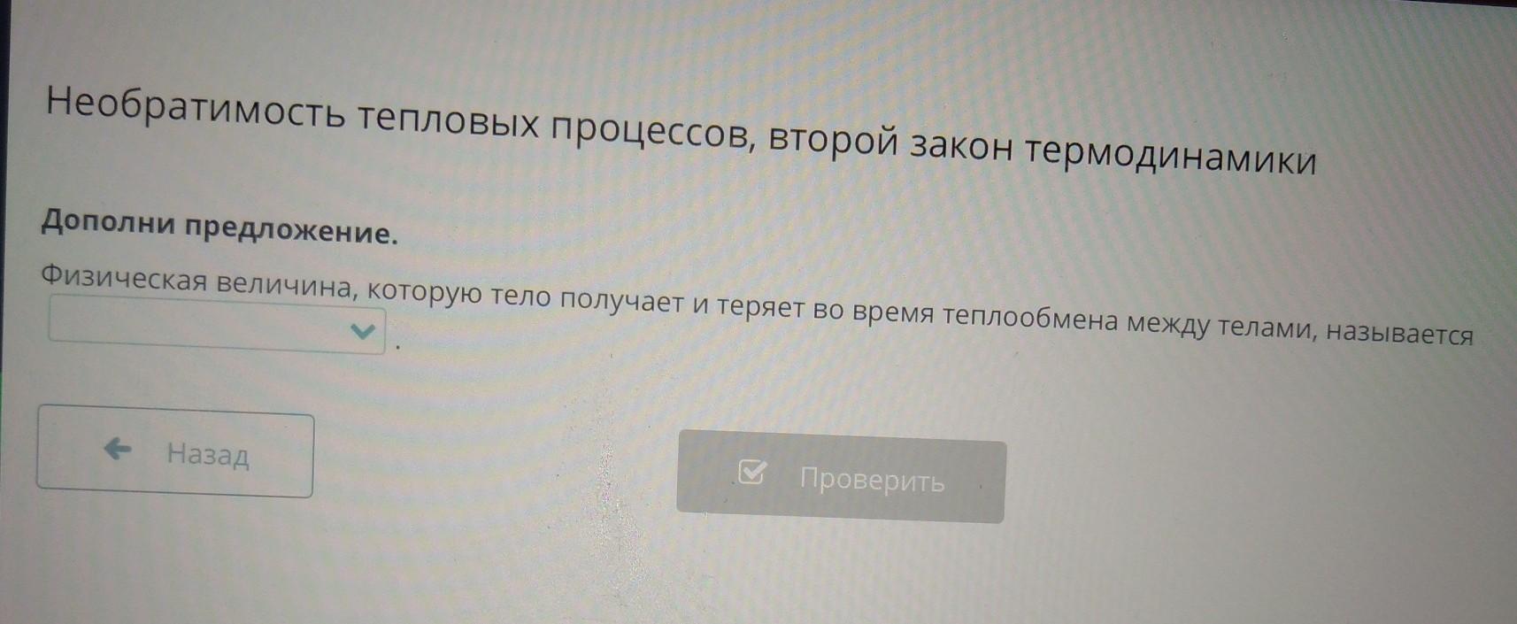 Необратимость тепловых процессов, второй закон термодинамики Дополни предложение. Физическая величина, которую тело получает и теряет во время теплообмена между телами, называется - Назад M Проверить изменением давления Количеством теплоты изменением площади изменением объема