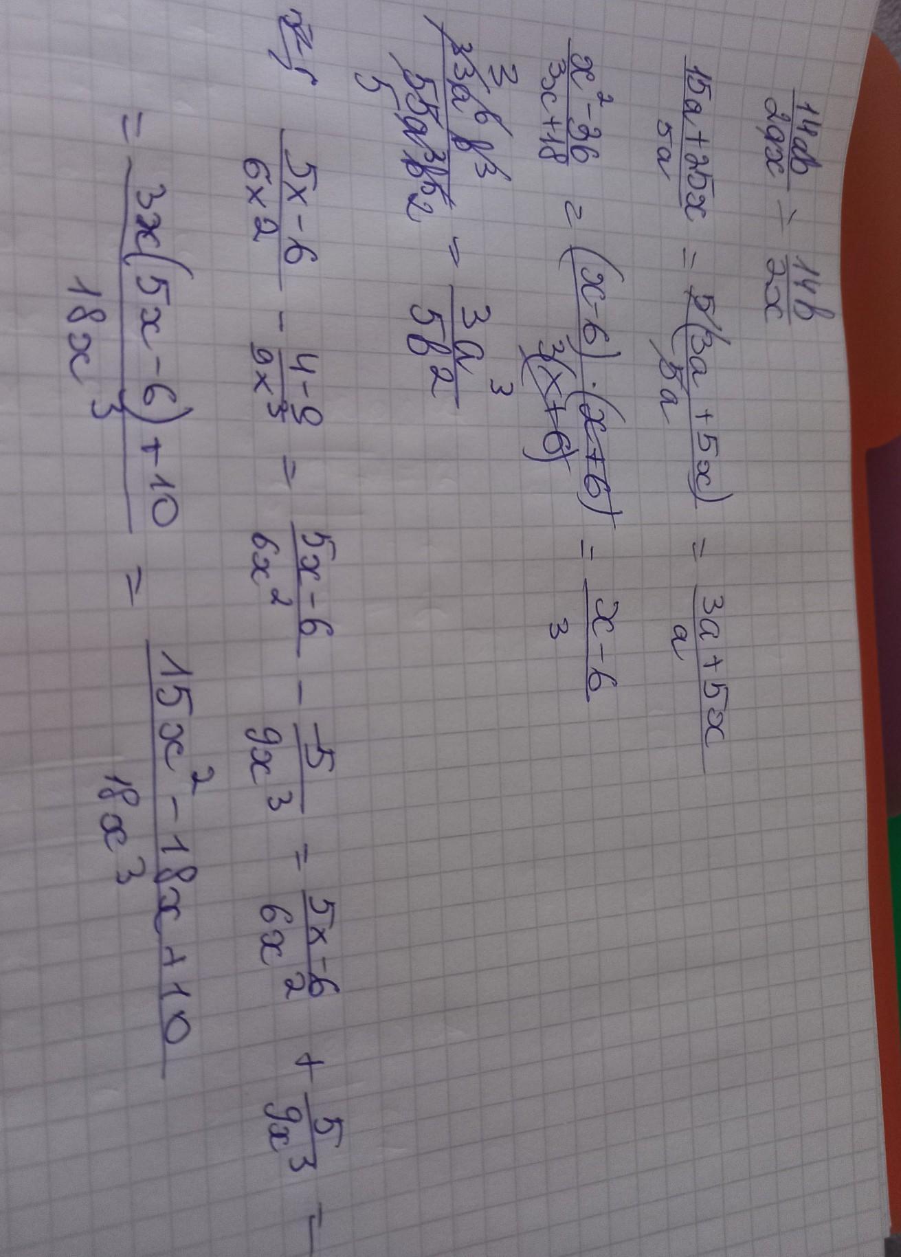 1. Просто делим 14 на 2, а сокращаются 2. 15а и 5а сокращаются, получается 3 сверху и 1 снизу, если 1 снизу, то можно записать так 3. Х^2 и 3Х, как и числа просто сокращаются