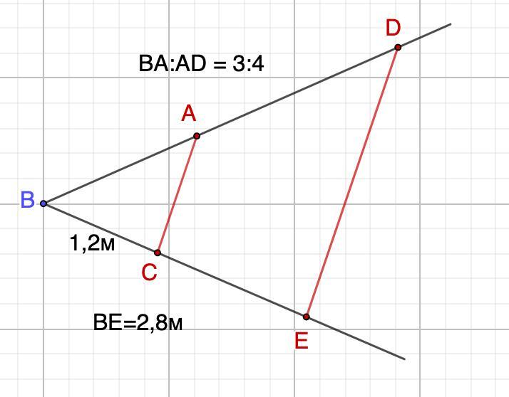 ВА и BD — отрезки одной стороны угла В; ВС и BE — отрезки другой его стороны. Узнайте, параллельны ли прямые АС и DE, если BA:AD = 3:4, ВС = 1,2 м и BE = 2,8 м.