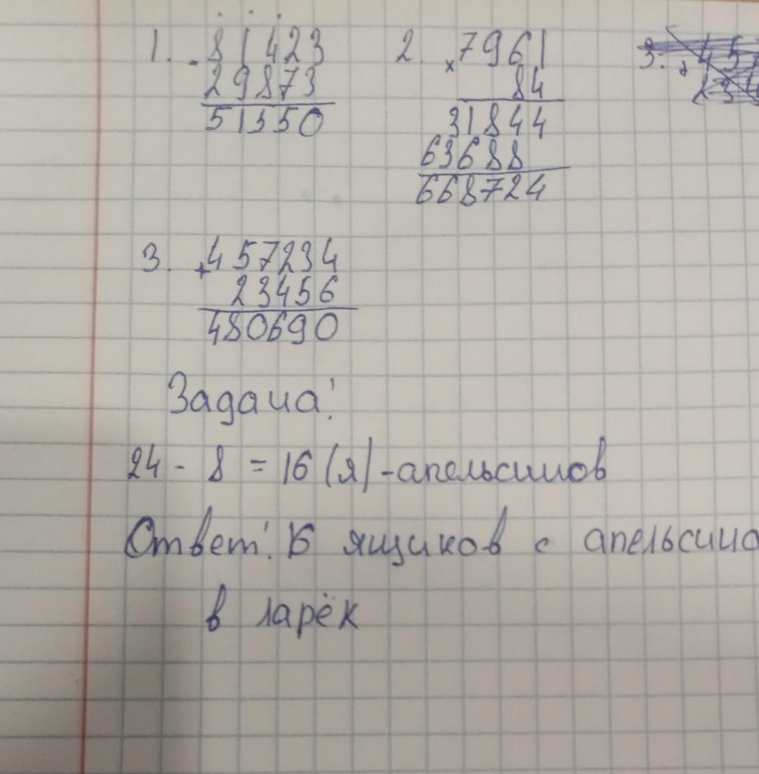 Реши столбиком: разность чисел 81423 и 29873 ,7961 * 84, 457234+23456; Реши задачу: В ларёк привезли 24 ящика яблок, это на 8 ящиков больше, чем апельсинов. Сколько ящиков с апельсинами привезли в ларёк?