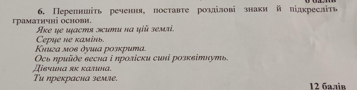 6. Перепишіть речення, речення, поставте розділові знаки граматичні основи. Яке це щастя жити на цій землі. Серце не камінь. Книга мов душа розкрита. Ось прийде весна і проліски сині розквітнуть. Дівчина як калина. Ти прекрасна земле.