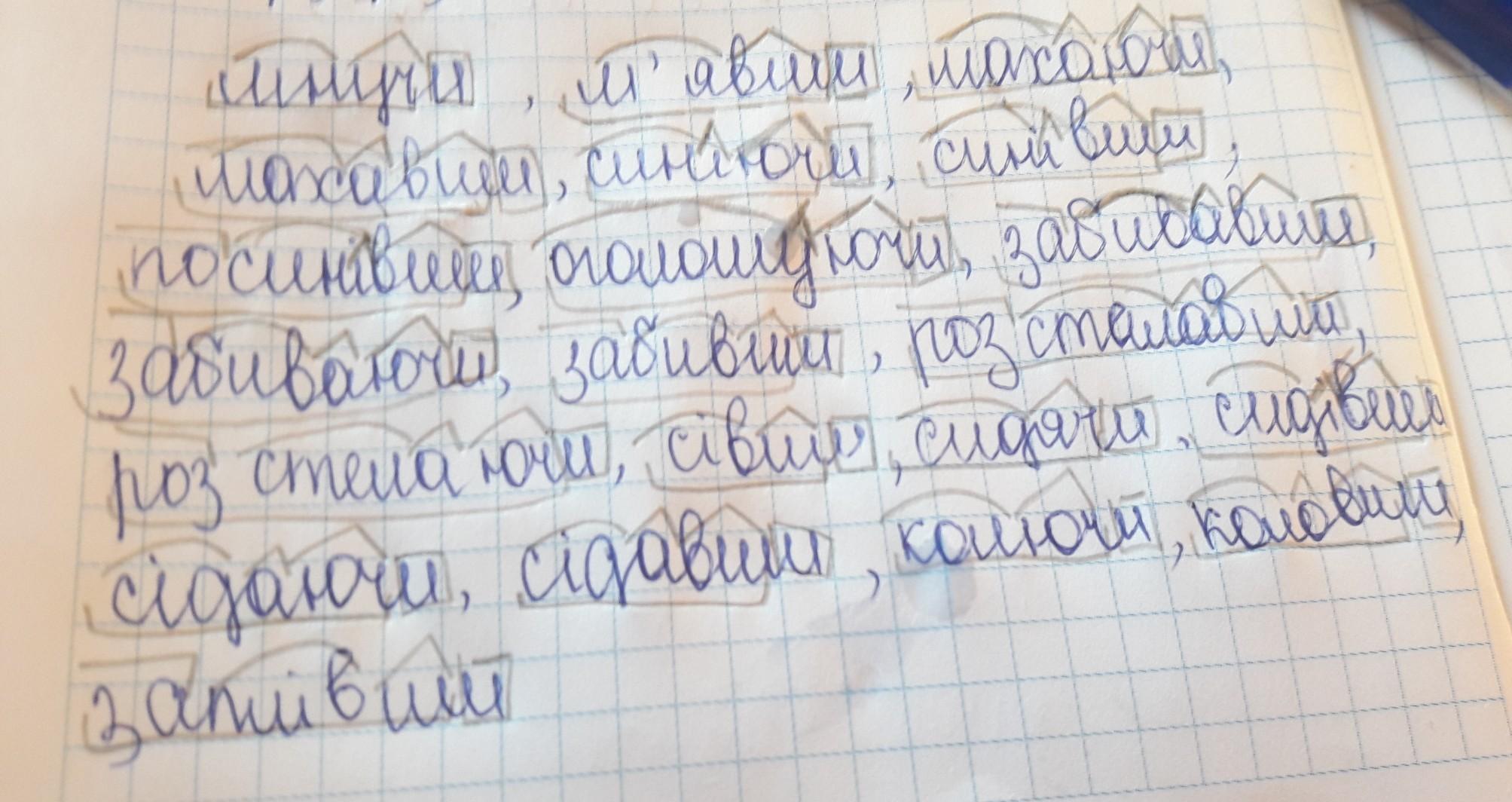 СЛОВА: Мнучи, м'явши, махаючи, махавши, махнувши, синіючи, синівши, посинівши, оголошуючи, оголошувати, оголосивши, забиваючи, забивавши, забивши, розстилавши, розстелаючи, розстеливши сівши, сидячи, сидівши, сідаючи, сідавши, колючи, коловши, заплівши