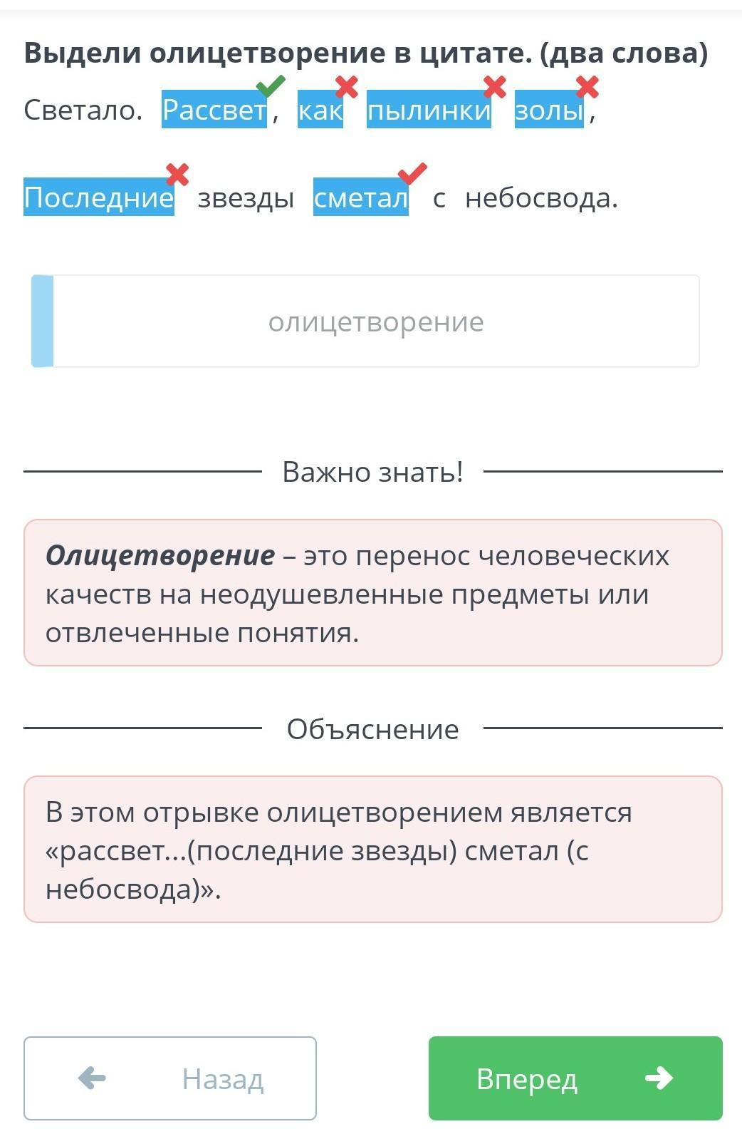Выдели олицетворение в цитате. (два слова) Светало. Рассвет, как пылинки золы, Последние звезды сметал с небосвода.