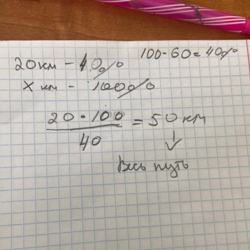 Велосипед проехал 60% маршрута и ему осталось проехать еще 20км. Какова длина всего маршрута? Число без едениц измерения.