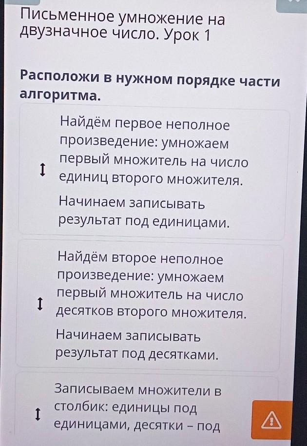 Расположи в нужном порядке части алгоритма. І Найдём первое неполное произведение: умножаем первый множитель на число единиц второго множителя. Начинаем записывать результат под единицами. 1 Найдём второе неполное произведение: умножаем первый множитель на число десятков второго множителя. Начинаем записывать результат под десятками. Записываем множители в столбик: единицы под единицами, десятки — под 1