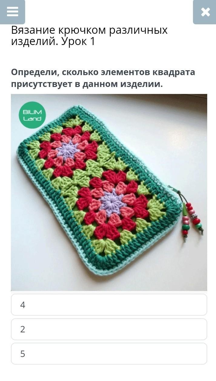 Вязание крючком различных изделий. определи, сколько элементов квадрата присутствует в данном изделии
