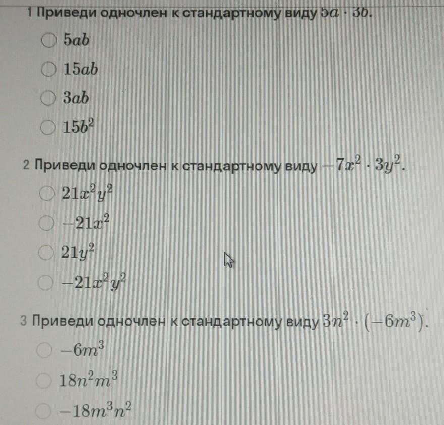 1 Приведи одночлен к стандартному виду 5а - 36. 5ab o15ab 3ab 1562 2 Приведи одночлен к стандартному виду — 7х2 . 3у2. 21x²y2 ? –21.22 21y? О — 21х2у2 а