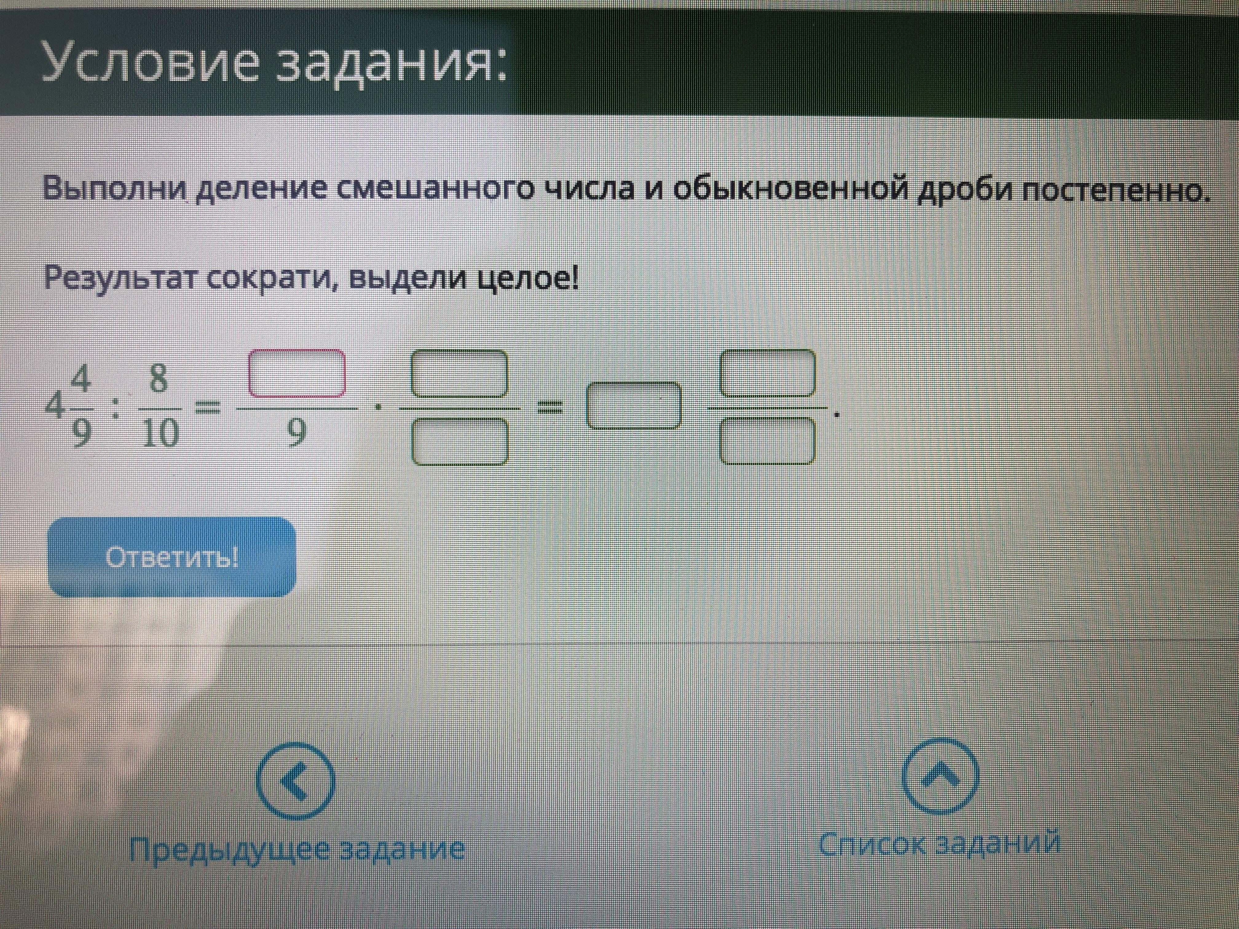 4целых4/9:8/10=40/9×10/8=5целых5/6