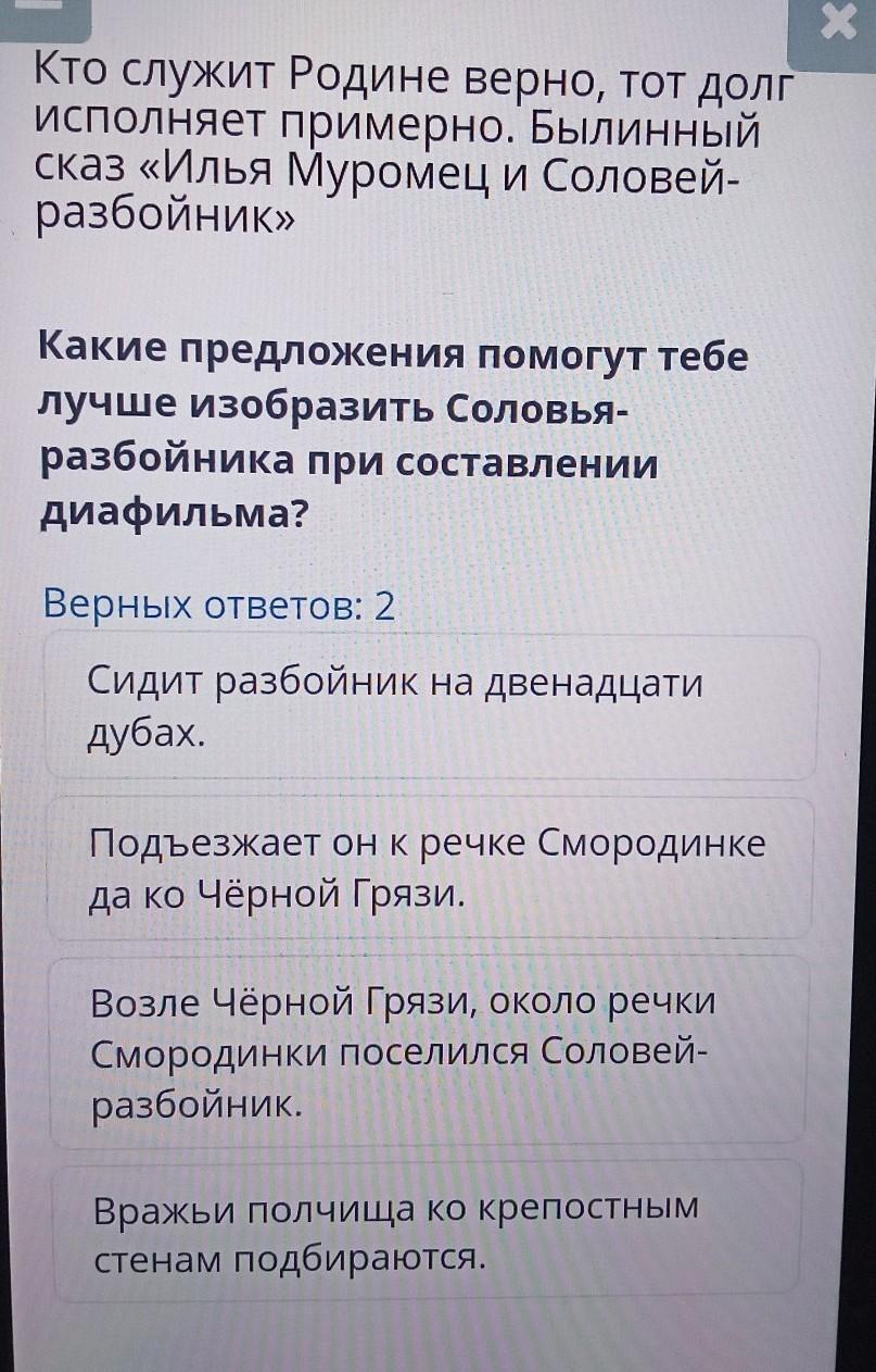 Кто служит Родине верно, тот долг исполняет примерно. Былинный сказ «Илья Муромец и Соловей- разбойник» Какие предложения помогут тебе лучше изобразить Соловья- разбойника при составлении диафильма? Верных ответов: 2 Сидит разбойник на двенадцати дубах. Подъезжает он к речке Смородинке да ко Чёрной Грязи. Возле Чёрной Грязи, около речки Смородинки поселился Соловей- разбойник. Вражьи полчища ко крепостным стенам подбираются.